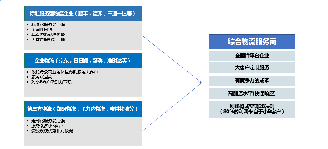趋势上,无论出身如何,这三类物流企业都不约而同地想成为“综合型物流服务商”,希望同时具备全国性服务能力、大客户定制服务能力,以及高效低成本的运营能力。