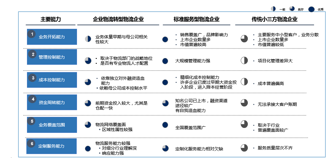 相对而言,标准服务型物流企业具有较强的综合能力,最接近于“综合性物流服务商”。