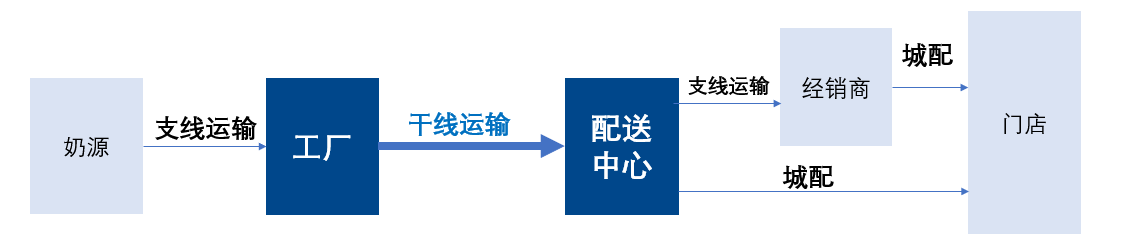 我们以乳制品的物流路线为例,来进行说明。路线如下图所示: