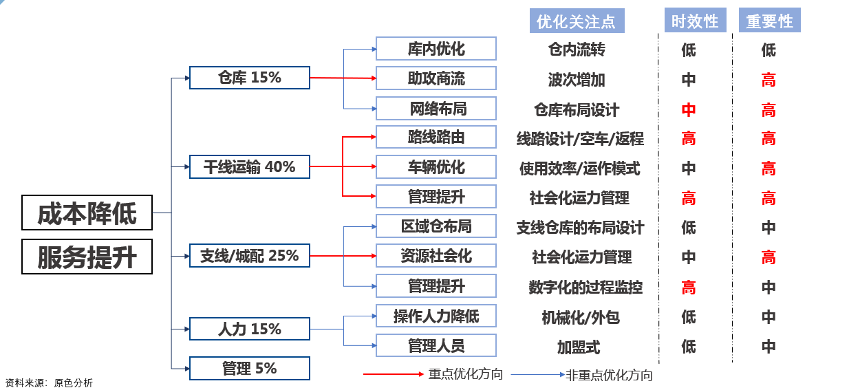 一般来说,仓库的布局对整体网络成本影响巨大,但是调整周期长,需要3年以上规划和很强的规划能力。而支线和成配,虽然整体运营成本占比也比较大,但往往掌握在经销商手里,整个渠道变革周期和难度都很大。
