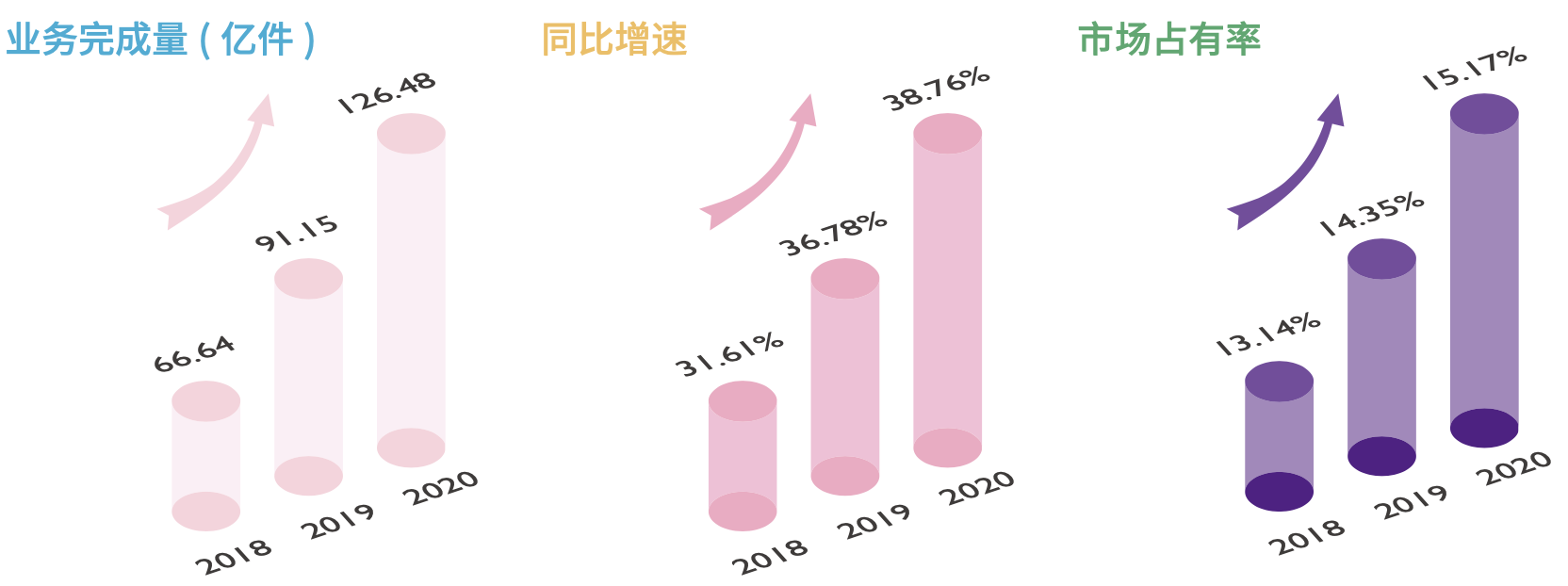 2020年,圆通速递快递业务实现业务完成量126.48亿件,同比增长38.76%,占全国快递服务企业业务量的15.17%,较2019年度提升0.82个百分点。2018年至2020年,公司业务完成量分别为66.64亿件、91.15亿件、126.48亿件,增速分别为31.61%、36.78%、38.76%,市场占有率分别为13.14%、14.35%、15.17%。