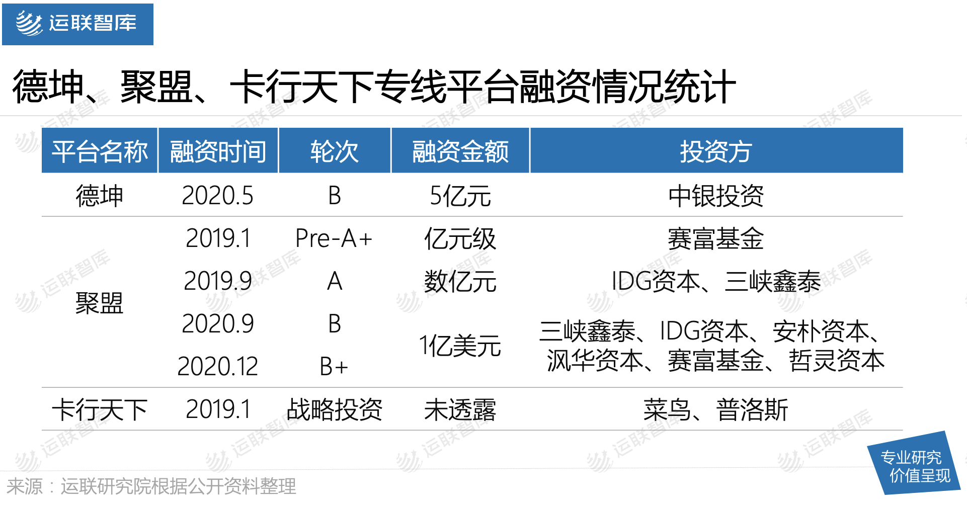 首先是专线平台,对专线的干线运输业务进行整合。近两年,资本继续在这一领域活跃,代表企业如德坤、聚盟、卡行天下等都获得过融资。
