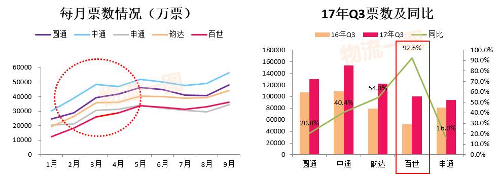 →百世17年Q3收入在通达系中最高,且同比增幅最大: