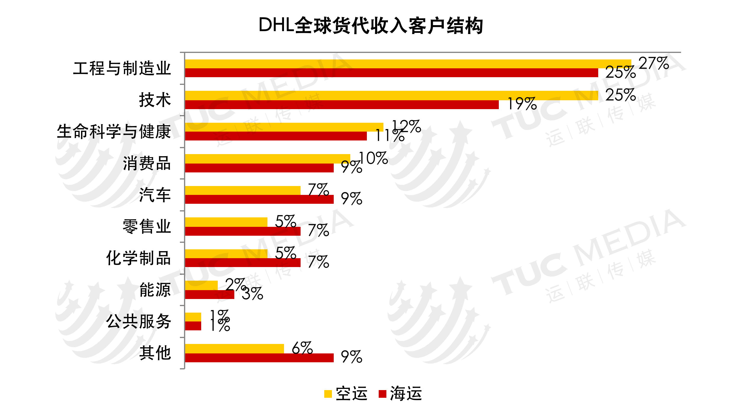 DHL全球货代的客户无论是空运还是海运,主要客户都集中在工程与制造、技术、生命客户与健康、消费品及汽车等行业。其中以工程与制造业、技术和生命科学与健康行业为主,占据了收入的一半以上。