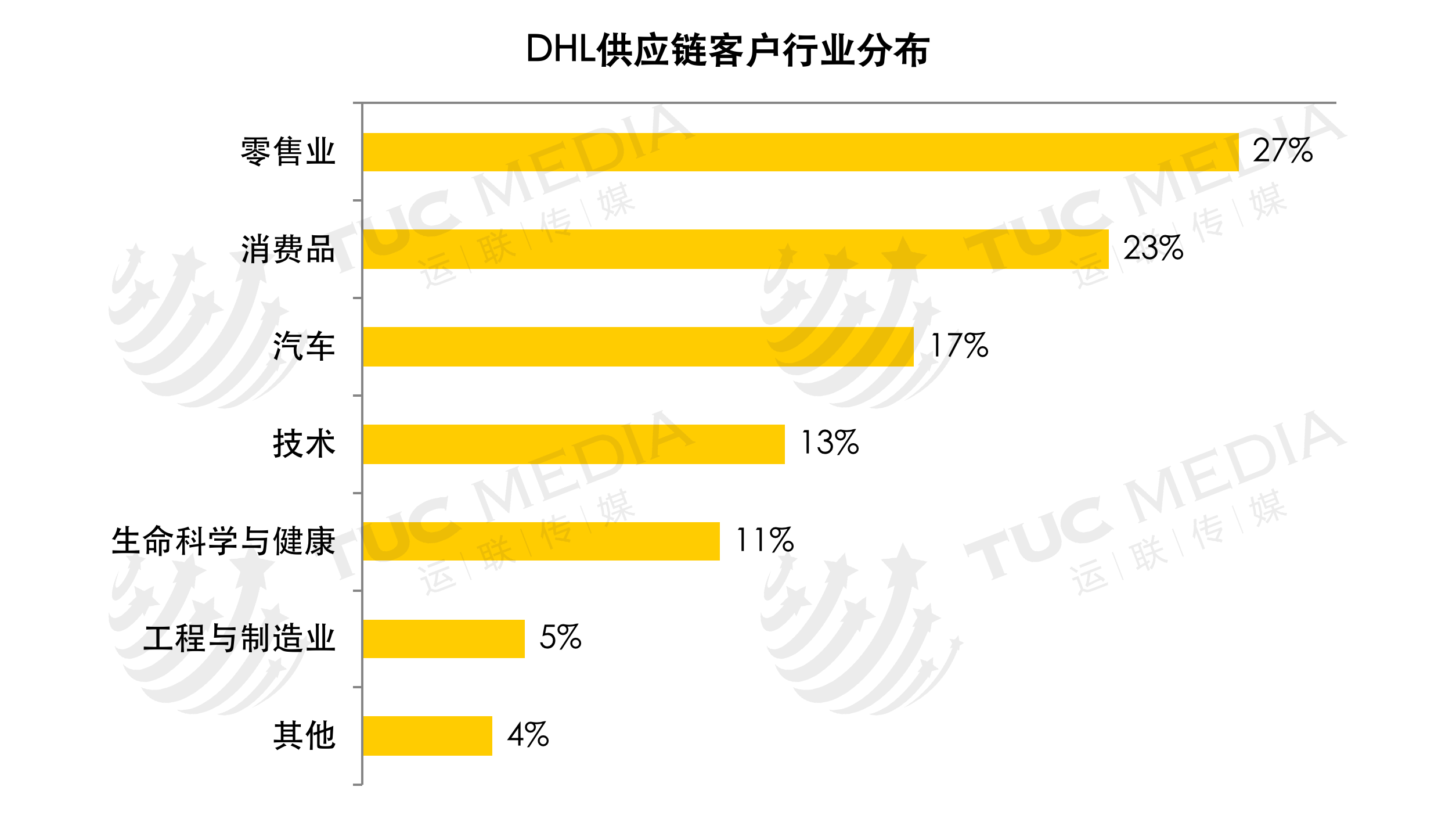 DHL供应链业务对客户的选择更具有针对性,其合同物流面对的是大企业客户,客户的行业分布与货代有一定的类似性,但主要以零售业、消费品、汽车和技术客户为主,其中汽车和零售行业的占比正在逐步扩大。