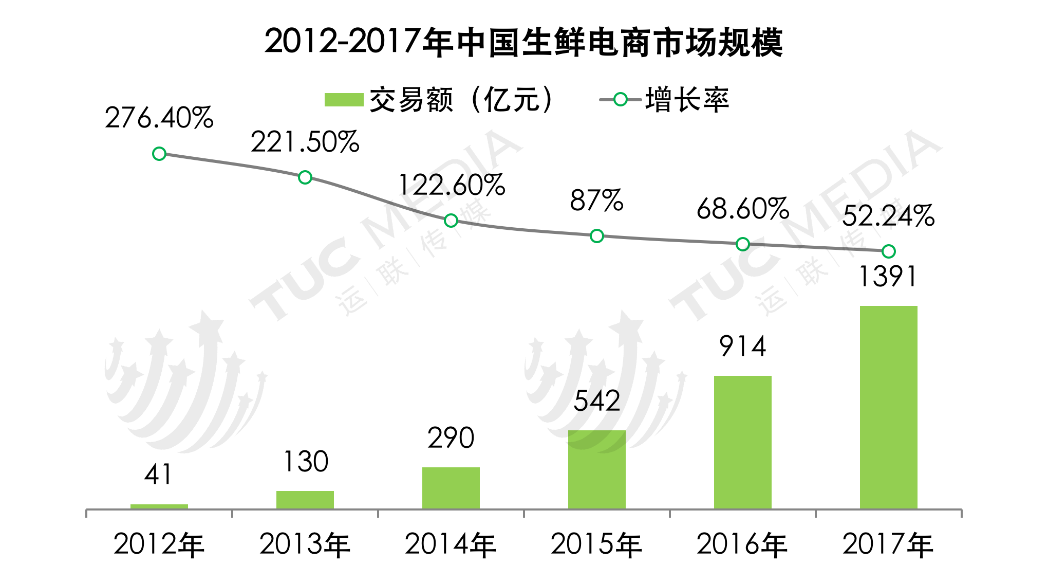 2017年,中国生鲜电商市场交易规模为1391.3亿元,同比增长52.24%。增速自2012年起持续放缓,生鲜电商行业已达到「挤出」阶段。但由于市场的强烈需求、电商巨头对供应链的持续性投资,以及资本方对部分企业的持续注资,生鲜电商市场规模依旧持续增长。