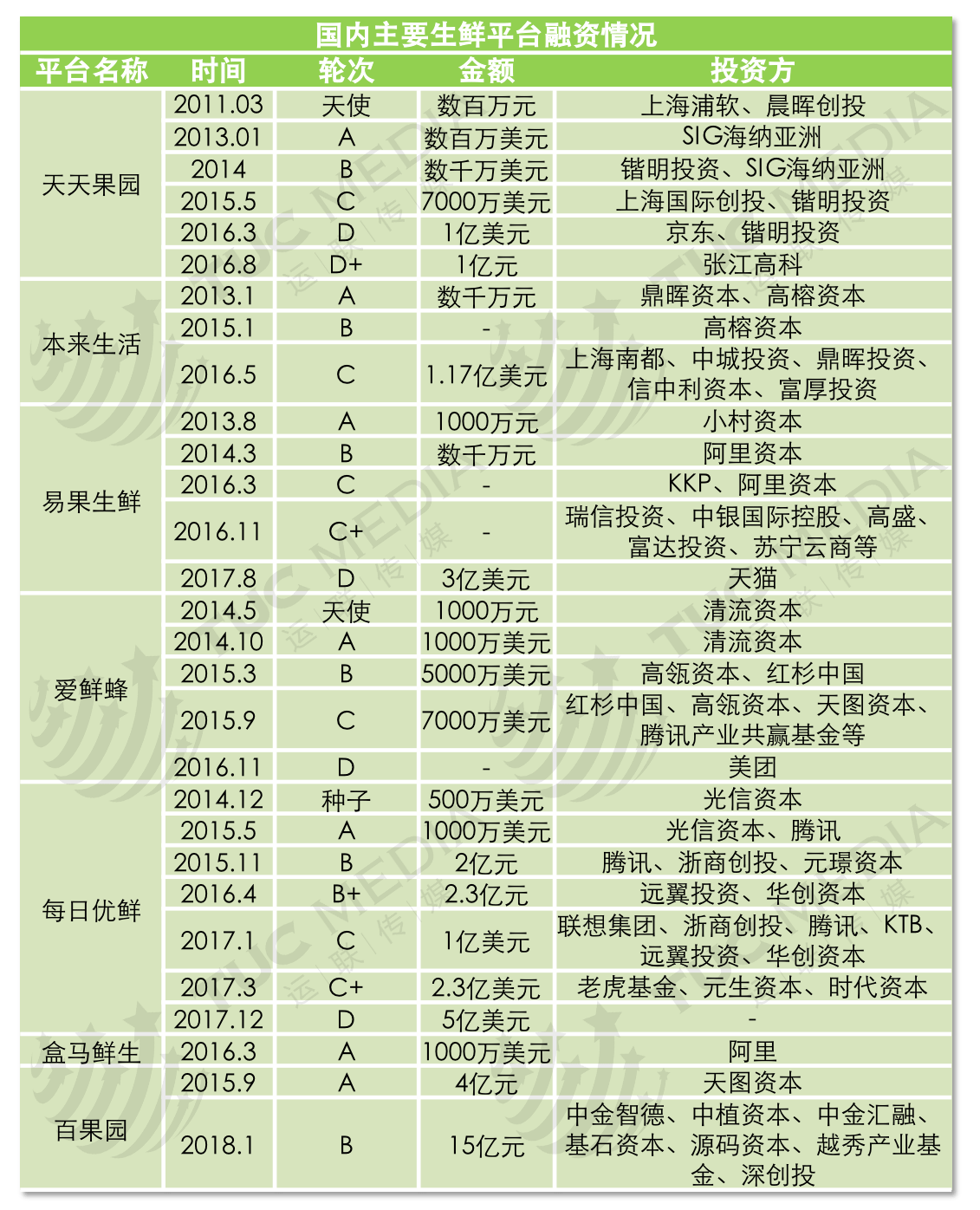 相对而言,2017年,还有两大生鲜平台被资本追逐:易果生鲜8月完成D轮3亿美元融资,用于安鲜达物流的基础建设;每日优鲜于1月、3月分别完成C轮与C+轮融资,共计3.3亿美元,用于加大前置仓及上游供应链体系建设的投入。