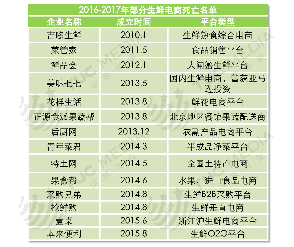 目前,生鲜电商行业中大部分企业由于资金困难已经逐渐淡出。例如美味七七,一家专门服务于上海及周边城市的区域龙头。曾在2014年5月获的亚马逊2000万美元投资,被视为亚马逊布局生鲜市场的第一步棋,却因为过快的业务增长,被大量的自建网点和巨额负债逐渐拖垮,于2016年4月宣布倒闭。