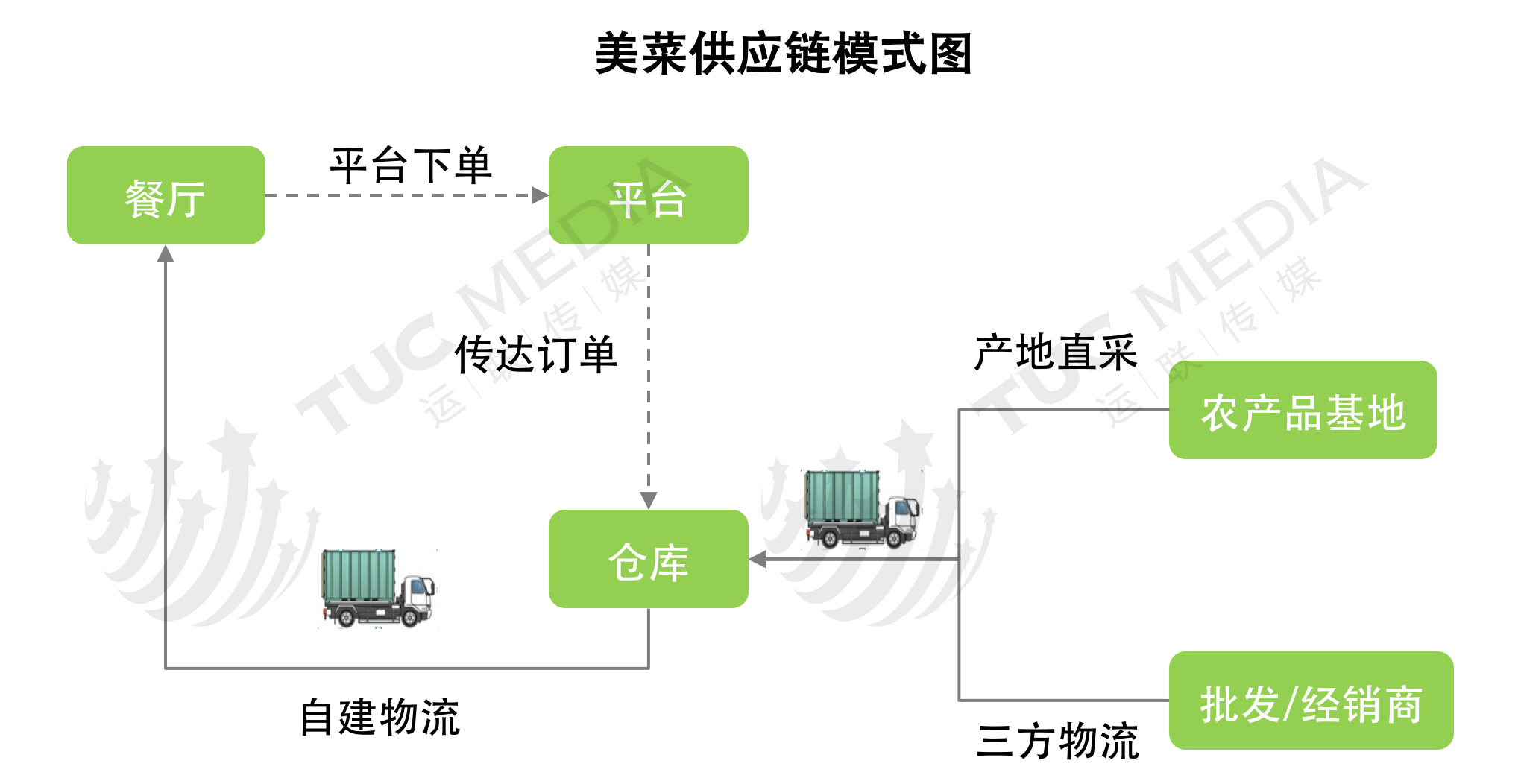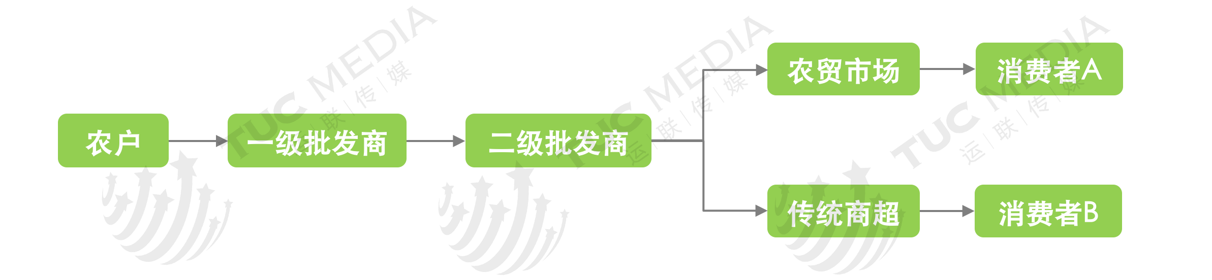 在传统的生鲜分销渠道中,一级批发商从农户手中获得生鲜货品,转至城市二批,然后通过自建或三方物流配送至农贸市场或传统商超(代表企业:沃尔玛、华联超市、大润发),最后消费者可前往购买所需的生鲜产品。