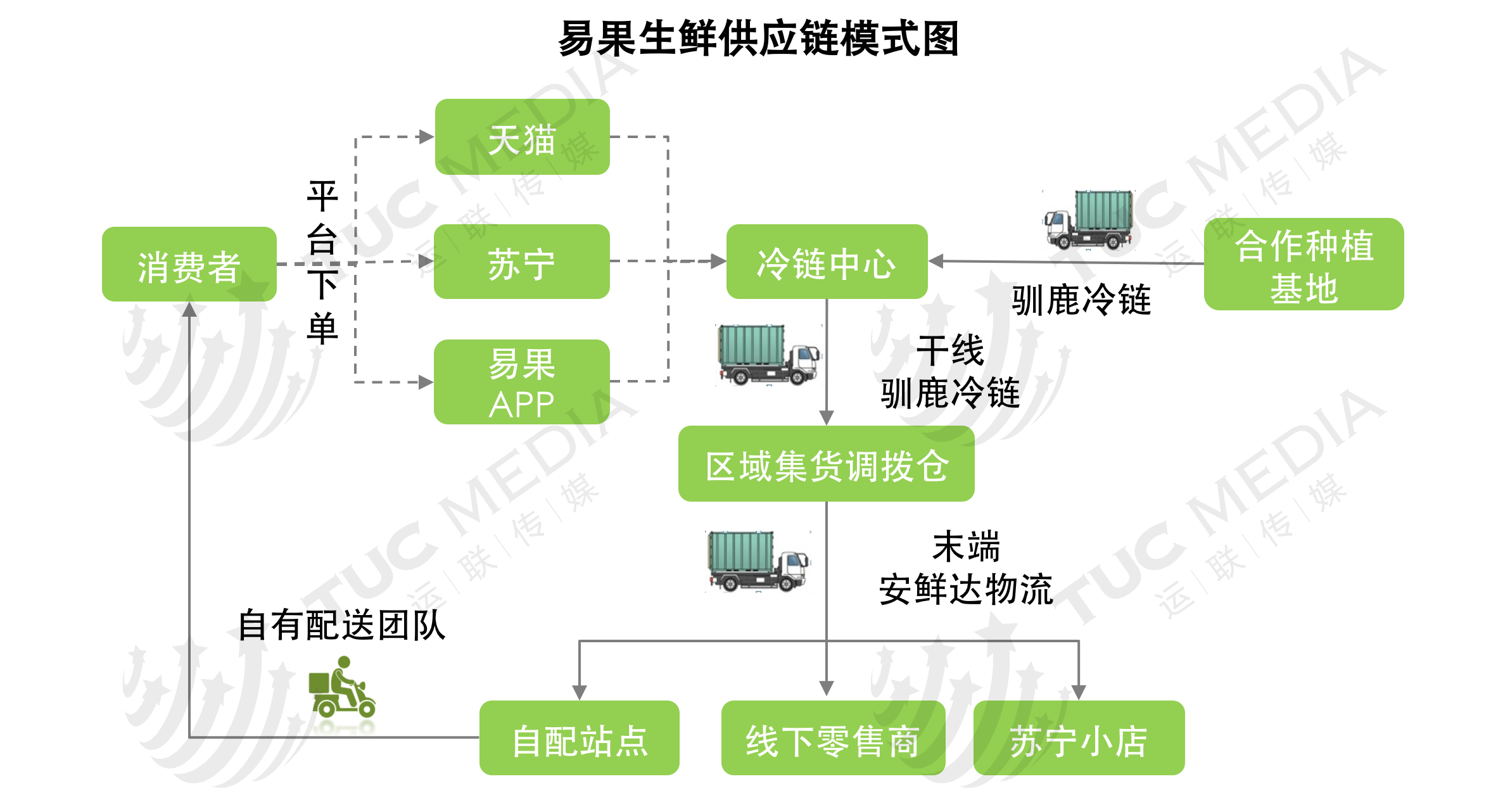 易果生鲜主要负责天猫、苏宁以及易果自身在内的阿里系生鲜平台系统的运营。当客户在平台下单后,信息通过整合传输至物流中心,再由安鲜达物流从区域集货调拨仓内进行配送服务。