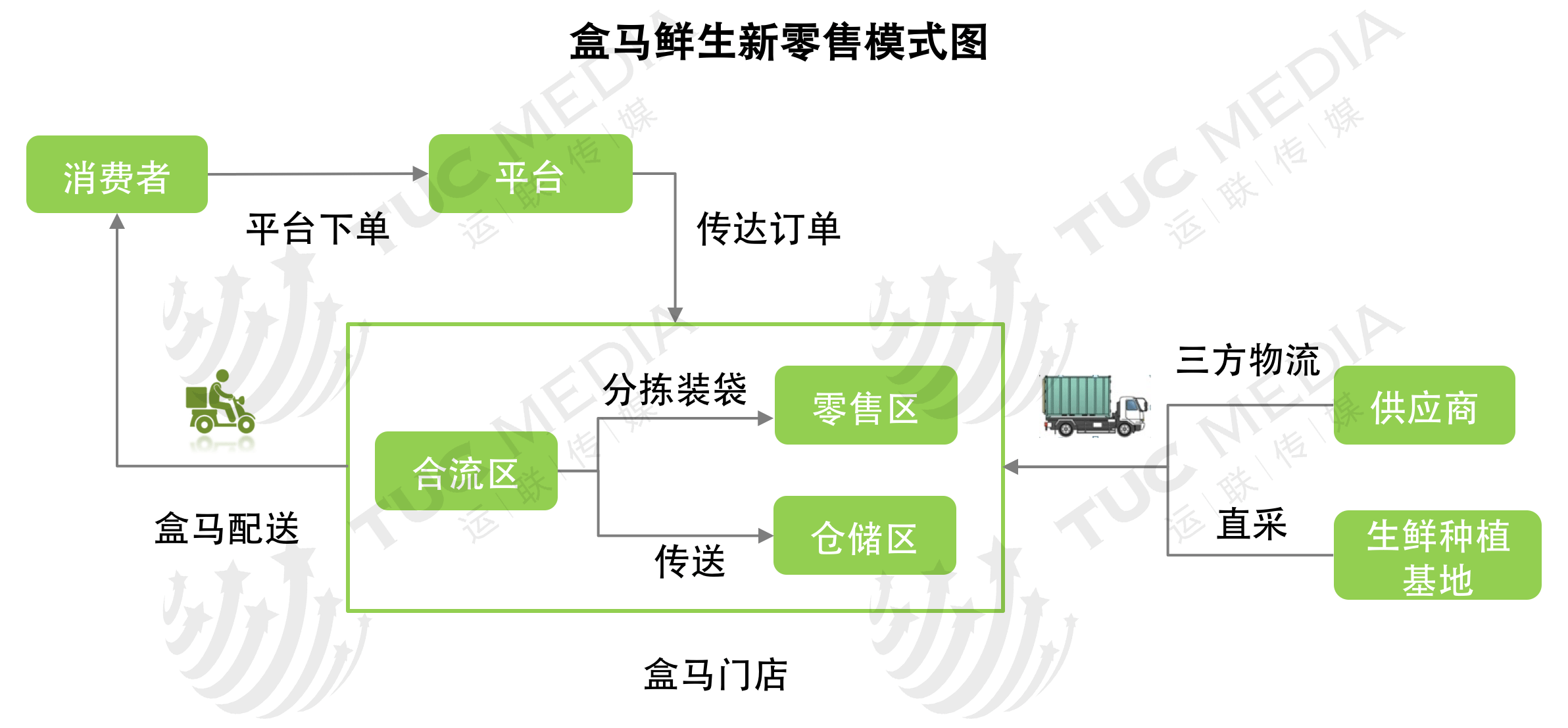 新零售模式代表企业盒马鲜生,采用线上+线下相结合的方式。供应商方面,依托天猫成熟的供应链体系;仓储方面,实行店仓一体化,店内配有自动分拣带,可实现自动化物流分拣;末端方面,由盒马配送员进行短途配送,可实现3km范围30分钟之内送达。