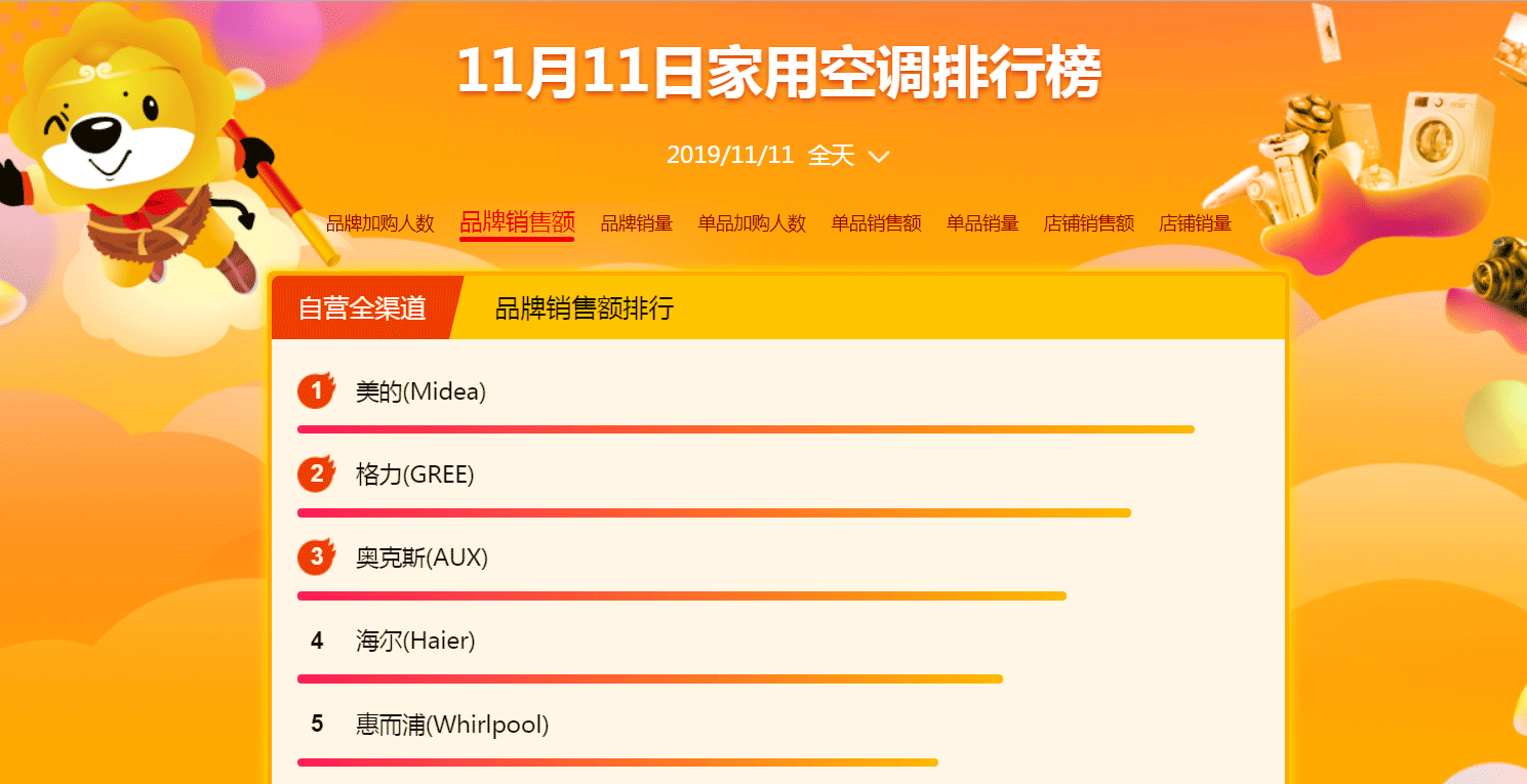 双十一期间,苏宁生活家电线上订单量同比增长79%,电视线上订单量同比增长68%,冰箱洗衣机线上订单量同比增长77.2%,空调线上订单同比增长120%。其中,悟空榜实时数据显示,11月11日当天,家用空调品牌销售额排行榜上,美的夺冠,格力、奥克斯分列二三位。