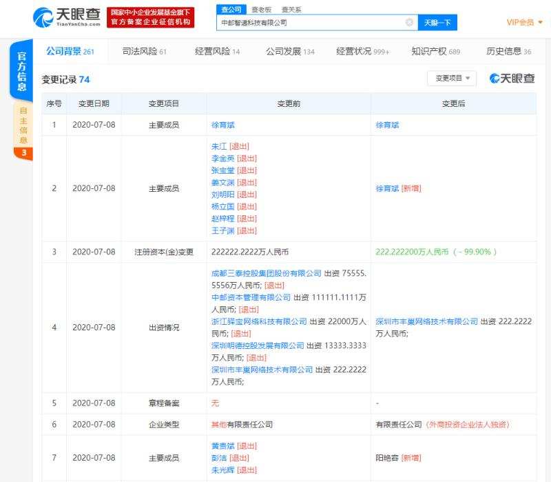【运联网】7月10日消息,天眼查数据显示,近日,中邮智递科技有限公司发生工商变更,注册资本由此前的约22.2亿人民币,减少至约222万人民币。中邮智递科技有限公司成立于2012年12月,公司经营范围包括计算机、电子技术开发、技术转让、技术咨询、技术服务;软件开发;计算机系统集成等,由深圳市丰巢网络技术有限公司100%持股。