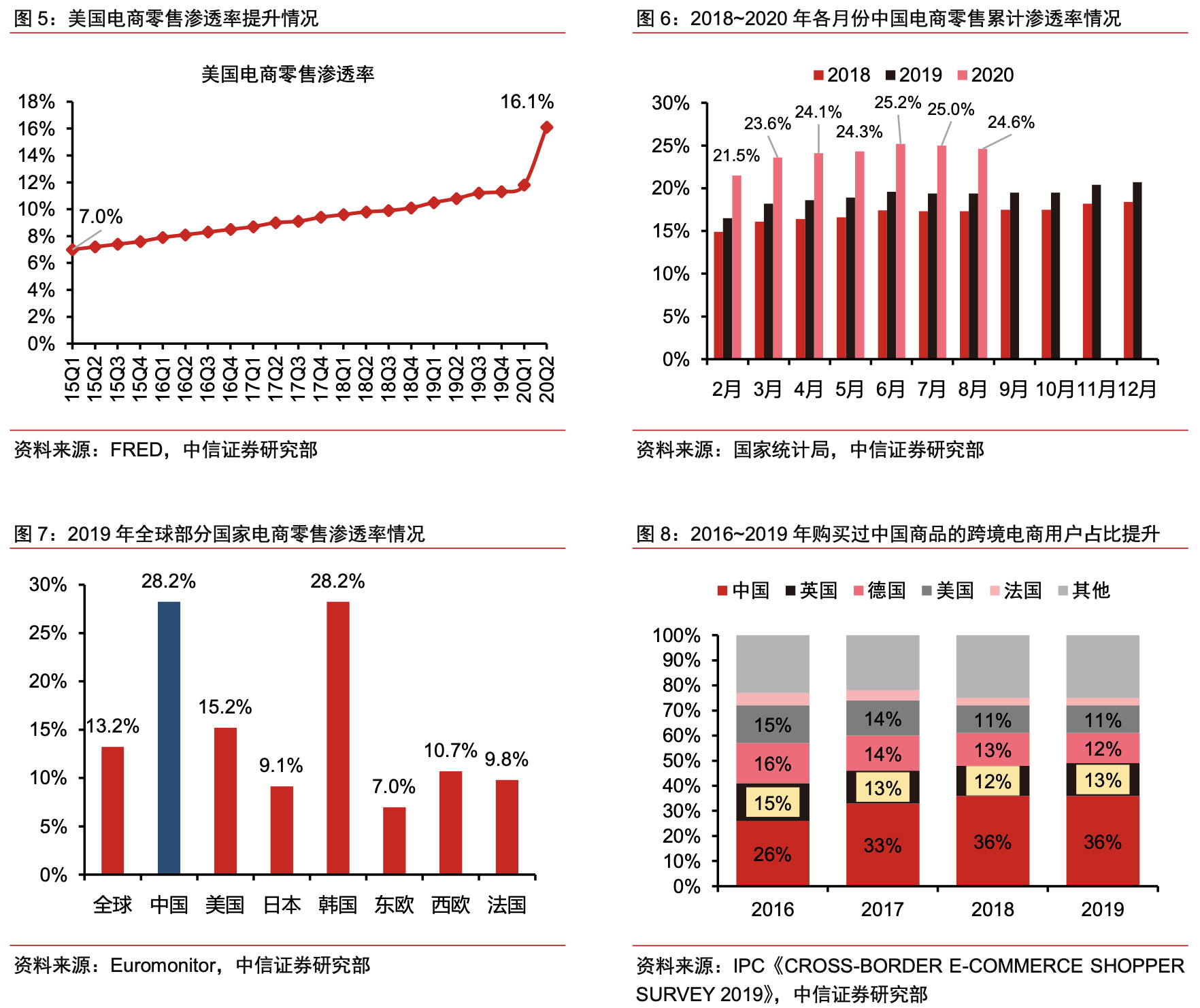 新冠疫情不仅加速了全球各国电商消费渗透,同时也对全球供应链产生了明显冲击,由于中国防控疫情成效显著,生产活动提早恢复从而保证供应链稳定。因此,这一波疫情加速全球电商渗透率提升下,拥有稳定供应链的中国受益明显。考虑到中国产品廉价优势以及海外电商消费习惯的形成具有一定粘性,同时其他国家电商渗透率存在较大提升空间(明显落后于中国),预计未来中国跨境出口电商景气度将持续维持高位。