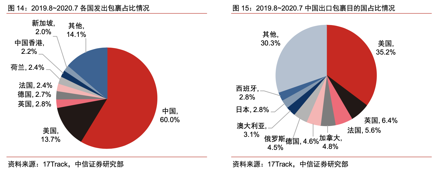 2019.8-2020.7全球总的跨境电商包裹中(跨境电商物流中的一种模式),中国发出的包裹占比60%,遥遥领先于其他所有国家。同时在中国发出的包裹中,中国发往美国的包裹最多,占比超1/3,发往英国和法国的包裹占比分别排名第二和第三。