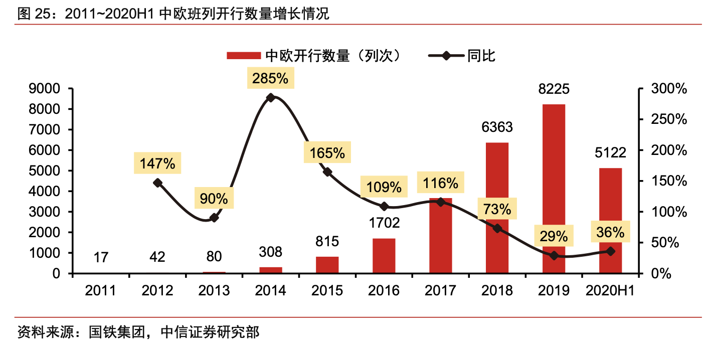 中欧班列早期开通的是渝新欧线路,后续不断发展,截止2020年2月底,已经开通了近30条班线。中欧班列也从最开始主要承接大宗货物运输到现在跨境电商运输货物占比快速提升。
