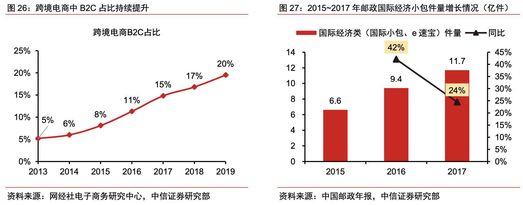 跨境电商从最初的商品网上信息展示,到跨境电商B2B大宗交易,到之后的跨境电商小额B2B交易,再到现在跨境电商B2C市场占比稳步提升。B2C跨境电商的快速发展也将推动B2C跨境电商物流市场的不断壮大,以B2C跨境电商物流中的邮政小包为例,2016/2017年中国邮政国际经济类小包件量分别同增42%和24%,增长趋势良好。