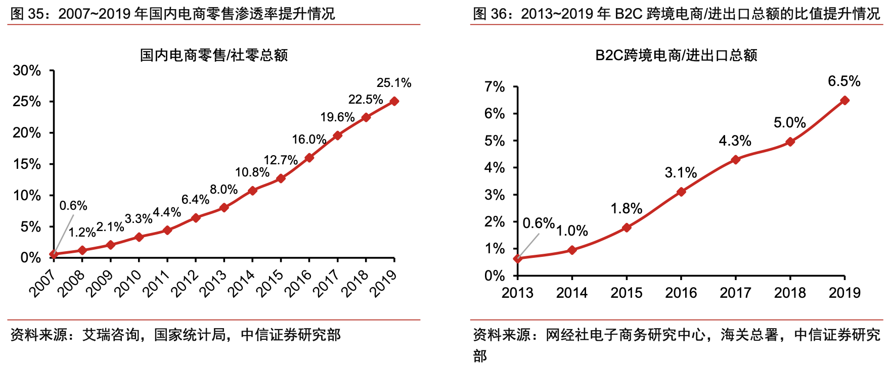 电商渠道正在持续替代传统的多层级分销渠道,进出口贸易也在经历电商持续渗透的过程。由于跨境电商相对传统外贸具备信息、价格等优势,同时消费升级推动国内消费者持续通过跨境电商对海外高端知名品牌商品的购买以及高性价比的中国产品借助跨境电商逐步走向全球,国内跨境电商在外贸中的渗透率提升至2019年的33%,其中B2C跨境电商渗透率提升速度更快。