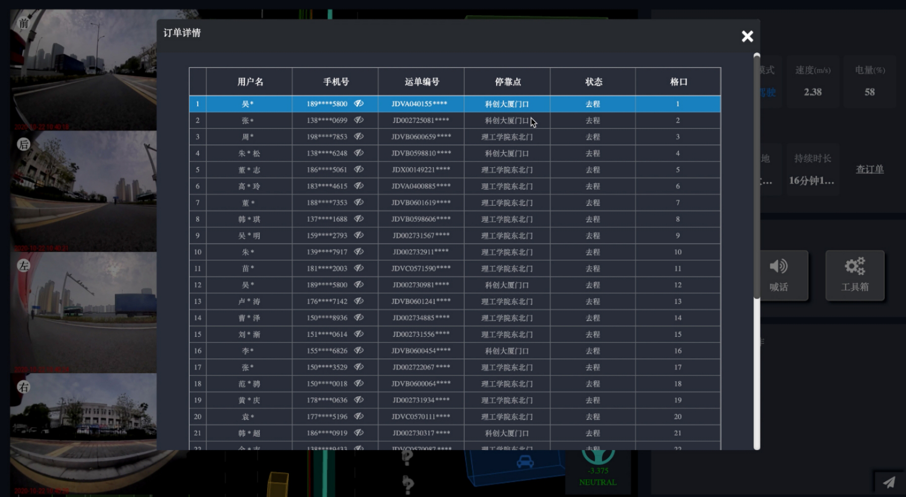 JDL京东物流智能快递车运营系统的管理界面:数十个订单正在配送中