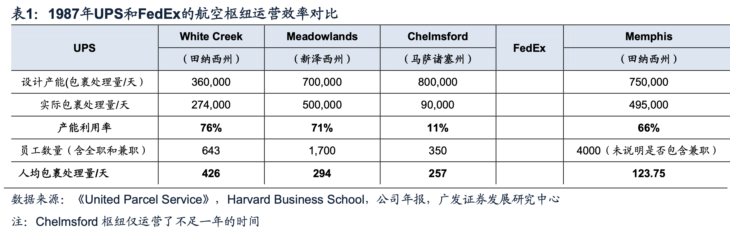 1987年,White Creek、Meadowlands实际包裹处理量可达到27.4万件/天和50万件/天,同期FedEx孟菲斯机场的转运枢纽日处理量约为49.5万件。