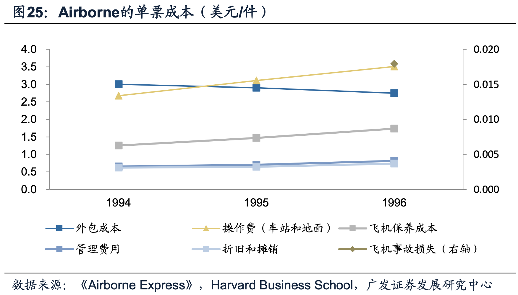在1995-1997年三年的时间里,Airborne的单票价格不断降低,但单票成本并未呈现同步降低的趋势(主要是分拣中心的操作费和飞机保养成本所致),导致盈利能力明显下降。