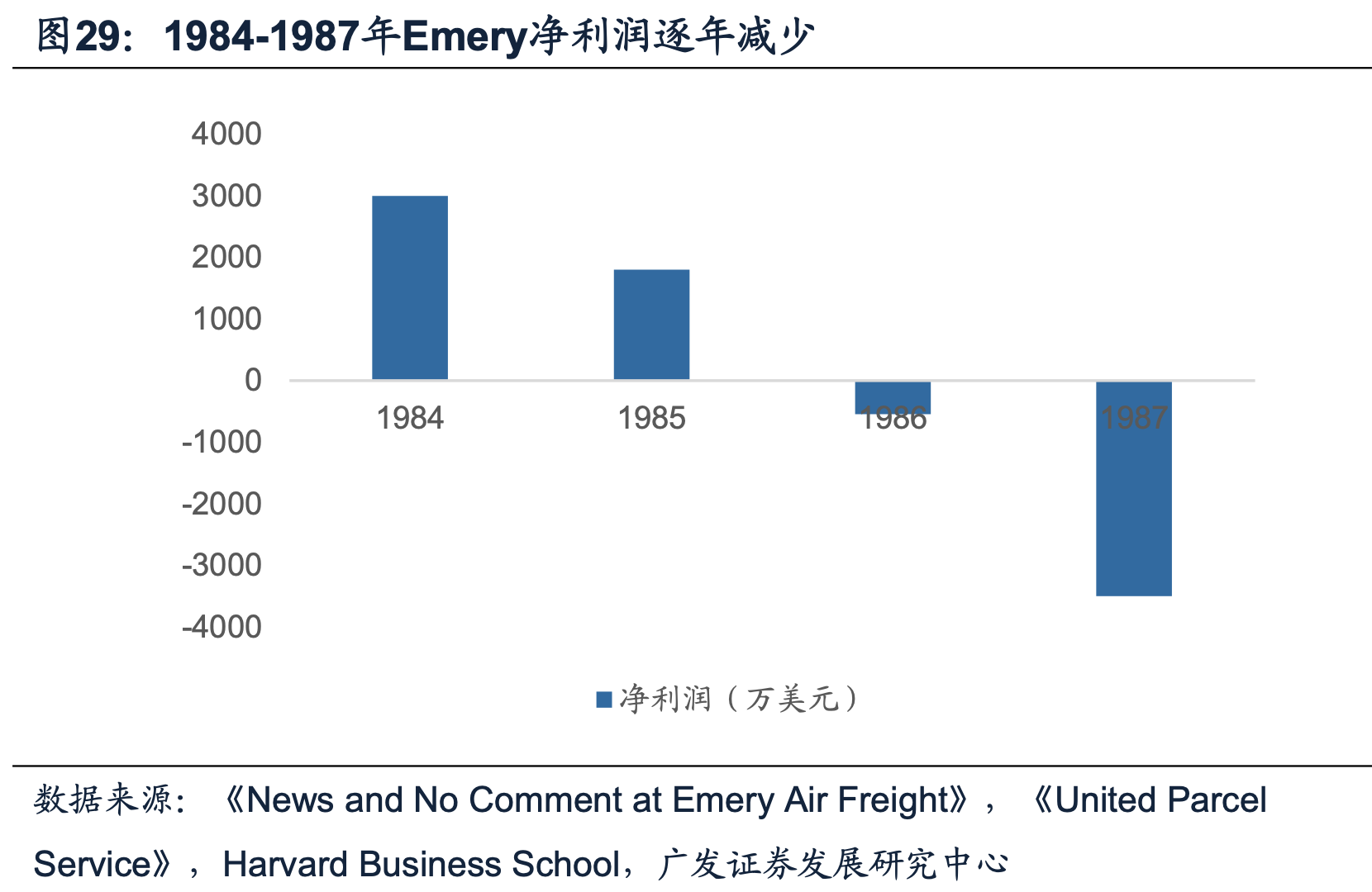 原本专长的重货运输领域失去优势,Emery最终被收购。1984-1987年间Emery公司的多位高管离职,公司的CEO也宣布退休,使Emery雪上加霜。