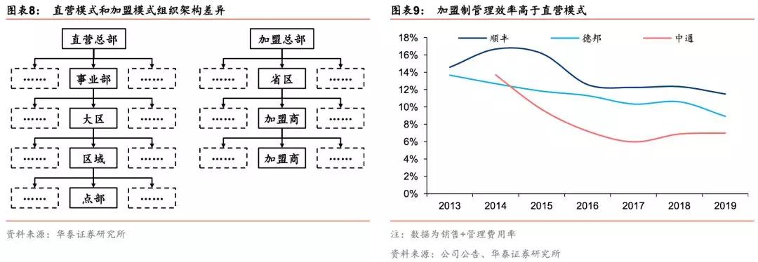 市场的广泛认知是,“顺丰、德邦和中国邮政(未上市)属于直营模式,通达系属于加盟模式”。实际上,顺丰伙伴计划、德邦事业合伙人和邮政劳务外包都借鉴了加盟制的经验,以此强化成本控制和人员激励。