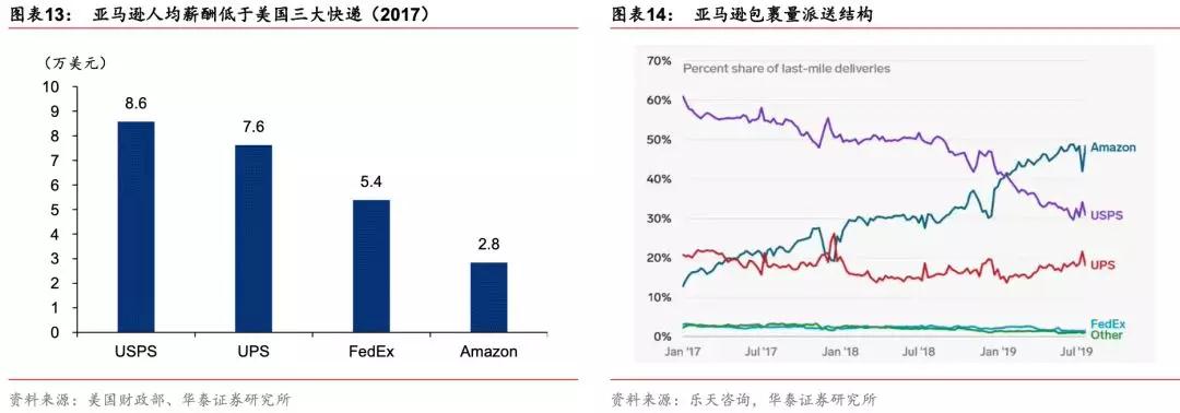 美国三大快递FedEx/UPS/USPS(未上市)工会势力强大,高昂的人工成本推高快递价格,且周末派送存在限制。亚马逊(AMZNUS)自建物流规避工会成本(亚马逊无工会),2019年在美国派送的件量同比增长155%至19亿件(Pitney Bows),其电商自营业务同期终止了和FedEx的合约。