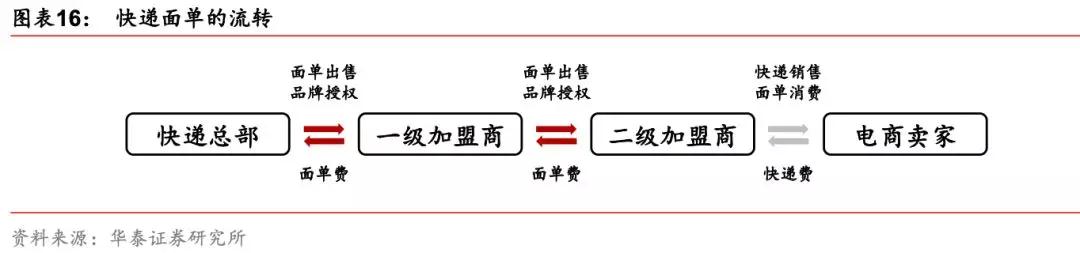 对买家(收货方)/卖家(发货方),面单扮演了商标的功能,同时承载了物流信息。在直营快递内部,面单即纸质物料(成本项),功能颇为简单;但在加盟制网络内,面单交易实现总部向一级加盟商,加盟商向次级加盟商的品牌授权(类似于制造业贴牌)。面单费也是加盟制快递总部的主要盈利来源,即面单在加盟制生态中扮演了名义货币的功能。