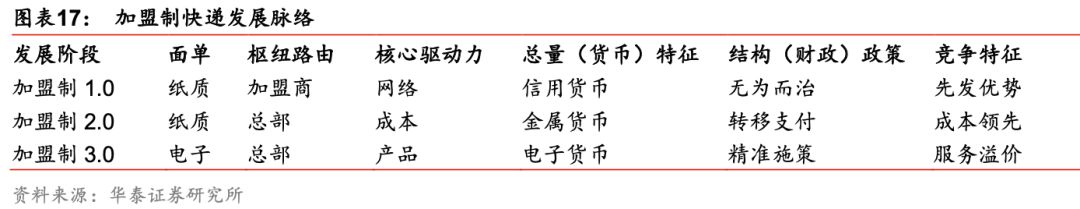 即使局部市场,庞大的网络才能满足客户点发全国的需求。因此,除了有限的区域内业务,跨区快递服务依赖于总部和若干加盟商协作(类似于铁路跨局列车)。以面单为核心,加盟制低成本解决了外源融资、柔性定价、内部管理等诸多难题,形成了中国特色的加盟制快递生态系统。