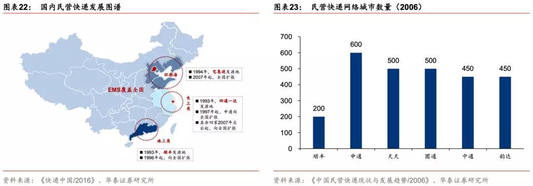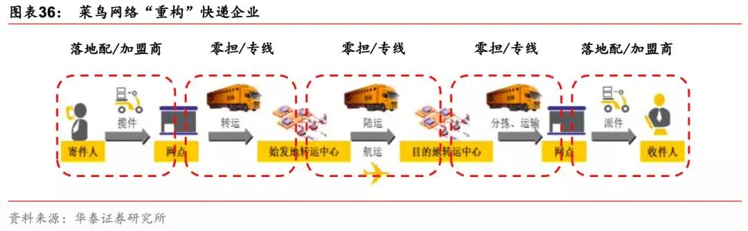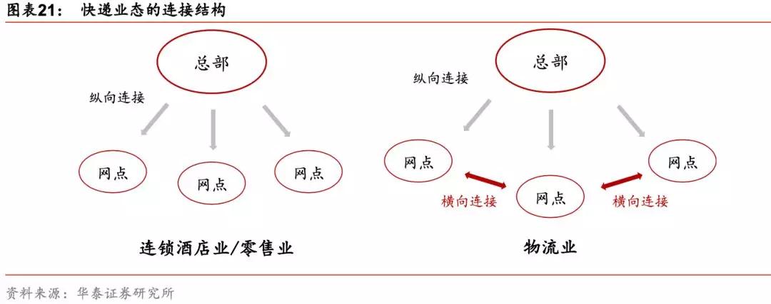 一个简化的快递流程为:揽件→支线运输→分拨→干线运输→分拨→支线运输→派送。即快递服务在物理空间上为链状结构,而酒店/零售等连锁业态则呈现点状结构。
