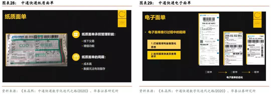 2012年,电子面单首次出现。相较纸质手写面单,电子面单通过热敏纸打印输出纸质物流面单,成本低效率高。以电子面单为基础,结合地址库、语义识别、三段码逻辑等,奠定了快递行业信息化的基础。我们称为快递行业的“电子货币”时代。通过三联单→两联单→一联单的进化,单票面单成本持续下降。