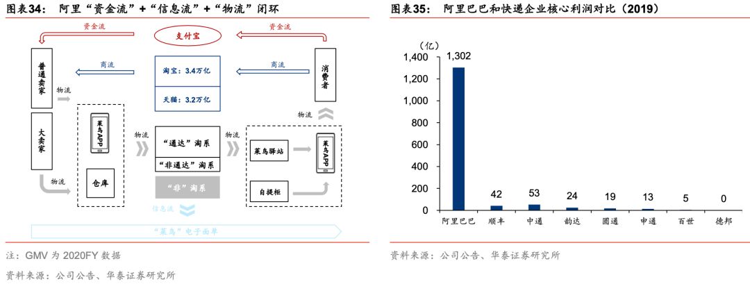 “商流决定物流”意味着物流在和商流的博弈中居于弱势,电商巨头与快递企业盈利规模对比可见端倪。以阿里巴巴为例,虽然面临反垄断压力,但其打造“资金流”+“信息流”+“物流”闭环的战略目标并未变化。
