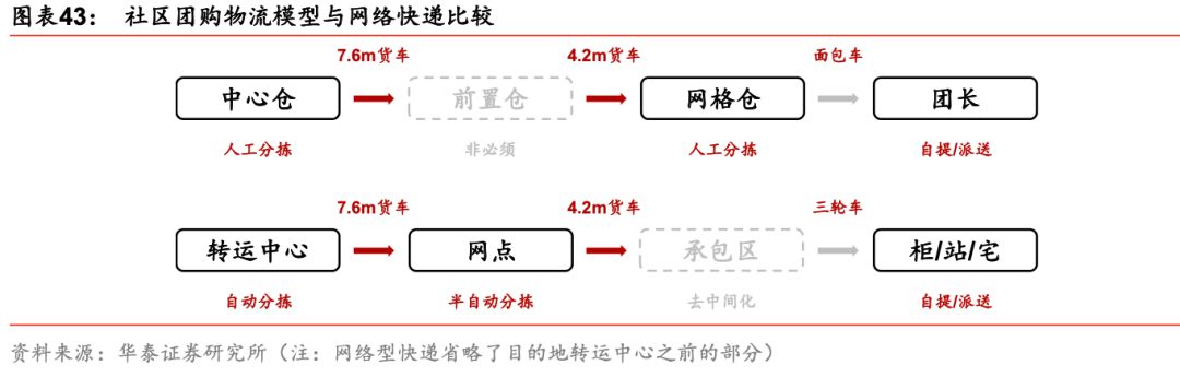 对于快递加盟商,网格仓和末端城配意味着新的机会;快递站点/快递员也适宜担任团长的角色。从长期看,随着团长的获客功能逐步剥离(聚焦履约),快递站点和社区团购末端具备融合基础;而快递也可承担社区团购的宅配功能(目前主要为上门自提或团长派送)。
