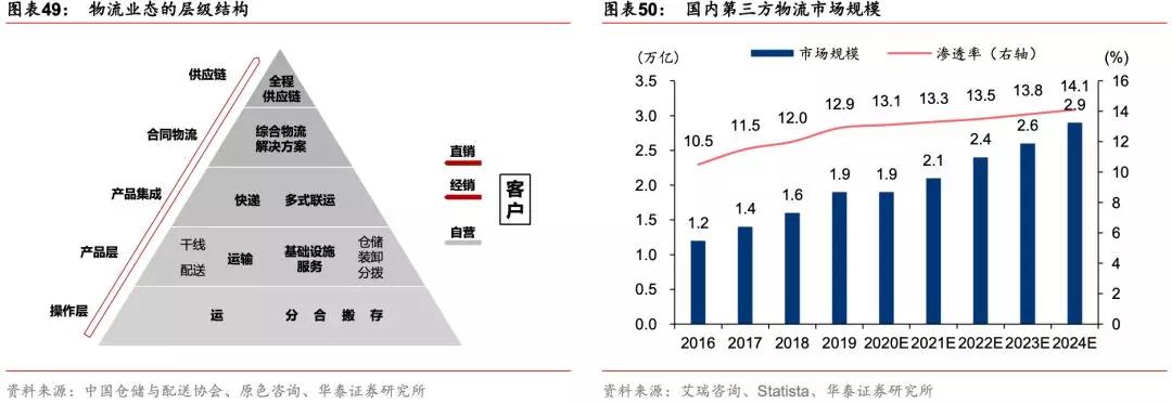 从运维角度,我们将物流业划分为操作层、产品层、产品集成商、合同物流和供应链服务五层,标准化程度依次下降。根据艾瑞数据,随着物流外包习惯的培养(提高效率降低成本),国内第三方物流市场规模将从2019年的1.9万亿增加至2024年的2.9万亿(CAGR=8.7%),渗透率从16年的10.5%提升至2024年的14.1%。