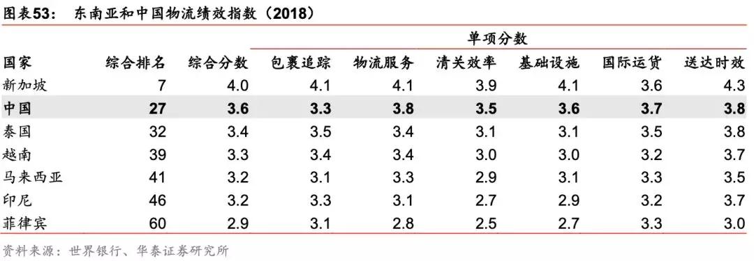 随着国内劳动力、土地等成本持续攀升,低端制造业开始向人工成本更低的东南亚转移(尤其是越南)。但东南亚国家产业集群普遍不够完善,大量原材料、半成品等需要经国内运输。根据世界银行的研究(2018),中国物流绩效领先东南亚主要国家;将国内物流模式向东南亚复制可显著提升当地物流效率。除快递产品,中国物流企业具备在东南亚提供全场景物流服务的可能(供应链综合服务)。