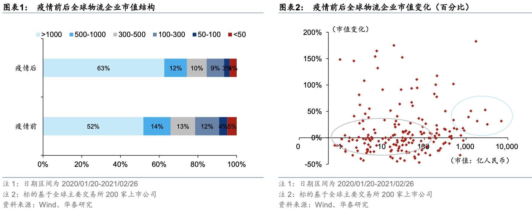 我们首先观察新冠疫情对全球物流业的影响:得益于全球性货币宽松与财政刺激,行业总市值从疫情前的3.6万亿增长至4.8万亿,但10家最大的企业贡献了1.0万亿的市值增幅。(除特别说明,报告正文货币单位均为人民币,汇率基于即期人民币中间价计算)