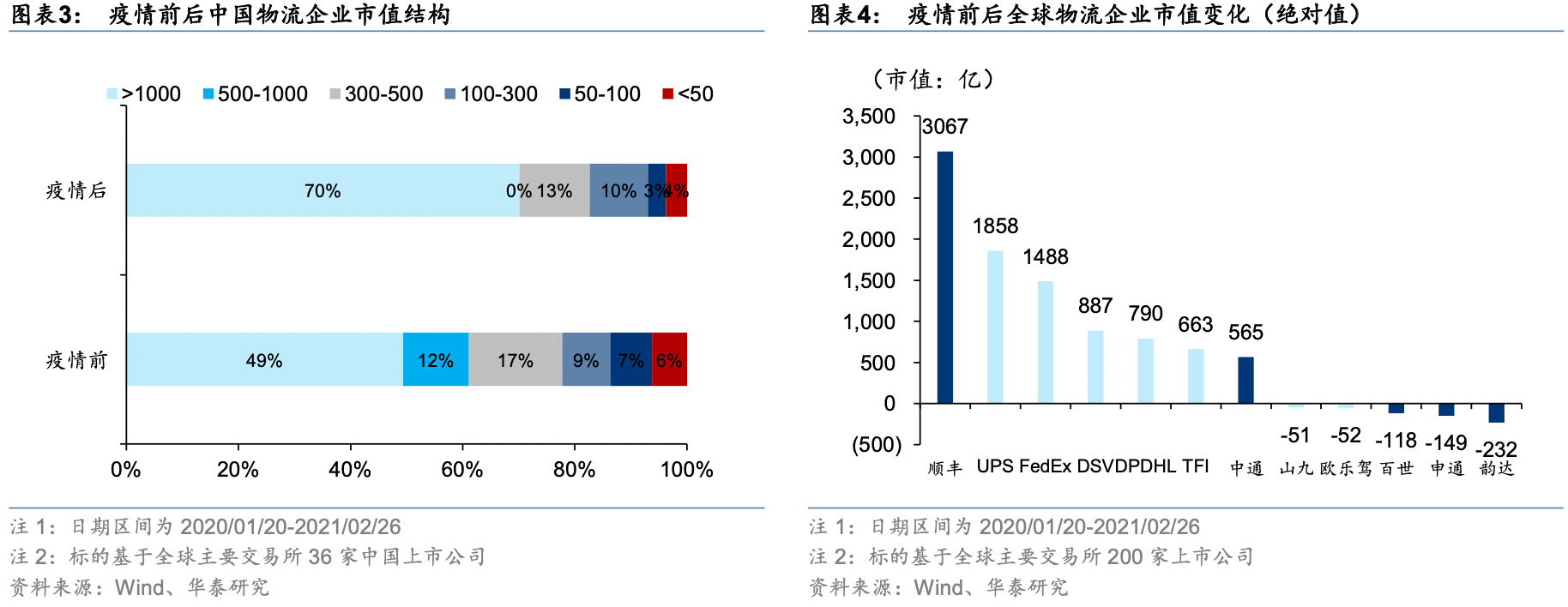 我们对国内36家物流上市公司的研究,同样表现为,市值集中度提升(行业总市值从约6100亿增加至约9500亿)。值得关注的是,疫情前后,顺丰和中通市值增幅名列全球首位和第七位,但韵达/申通/百世成为全球物流企业中市值降幅最大的三家企业。