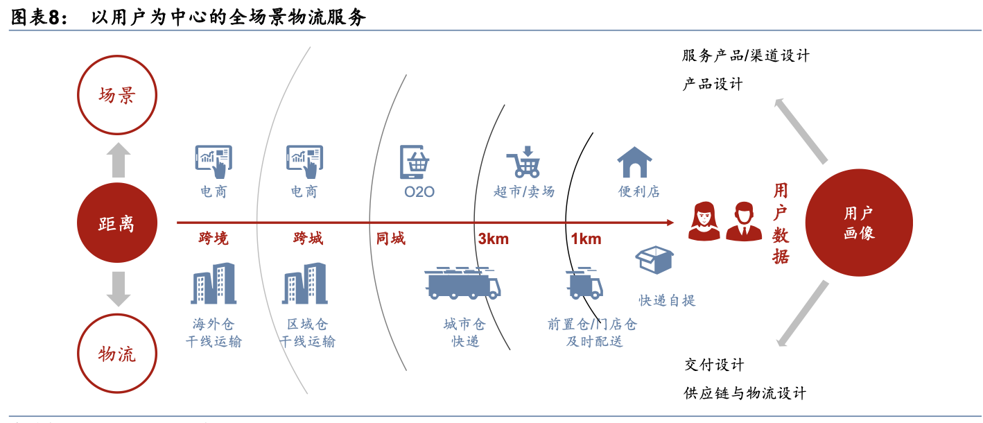 以零售物流为例,跨境、跨城、同城、即时配送构成全场景物流服务。随着地域范围的收敛,物流网络趋于碎片化,竞争周期相应拉长:局部市场防御难度加大,进攻方需要逐城“巷战”。这一结论对商流同样成立,地域范围:电商(全国型)>团购(城市型)>外卖(蜂窝型)。