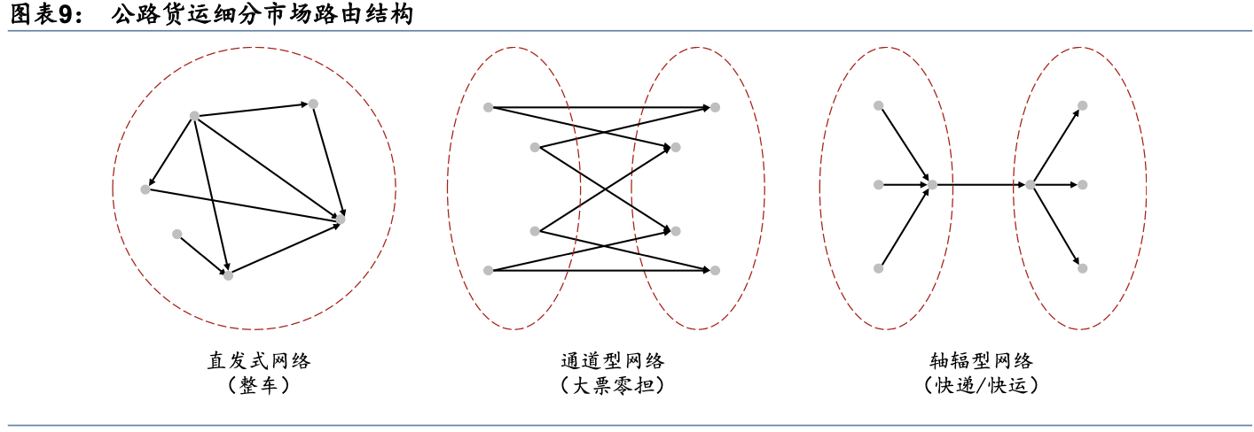 物流业中(产业互联网),高边际成本使得成本效率优先于连接数。货量不足的情况下,中转集散综合成本低于点点直发(增加中转成本和全程时限,提高装载率以降低运输成本,使得总成本最优)。因此,不同细分市场有其最优结构:快递/小票零担为轴辐型(HUB),大票零担为通道型(专线),整车则进一步简化为点点直发。
