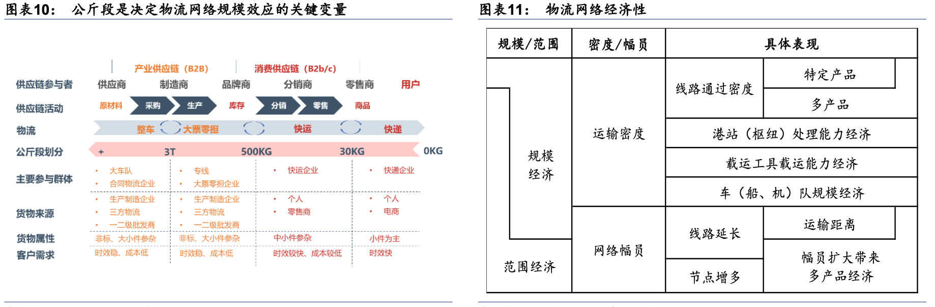 规模效应是商业竞争的高权重要素:首先,不同业态规模效应差异显著,如物流产品规模效应随公斤段提升下降;其次,抓住(决定规模效应)关键要素的参与者更有希望赢得竞争。