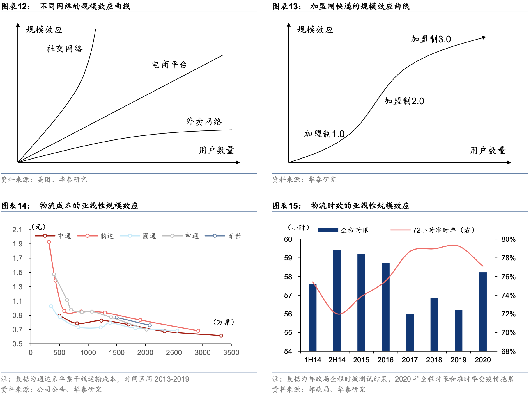 由于物流成本和物流时效不能无限下降,物流业的规模效应最终趋于收敛(亚线性规模效应)。当然,在物流网络发展的早期,规模效应仍可能表现为线性/超线性增长。以加盟制快递网络为例,加盟制1.0实现了超线性增长,而加盟制2.0和加盟制3.0则接近于线性增长和亚线性增长。