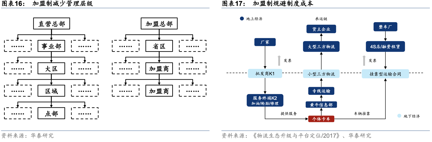 以快递为例,加盟制显著降低了企业的组织成本:减少管理层级,规避制度成本,加盟商自激励。根据董中浪先生的观点(全球智慧物流峰会:2019),组织成本与服务溢价的匹配是商业模型成立的前提。