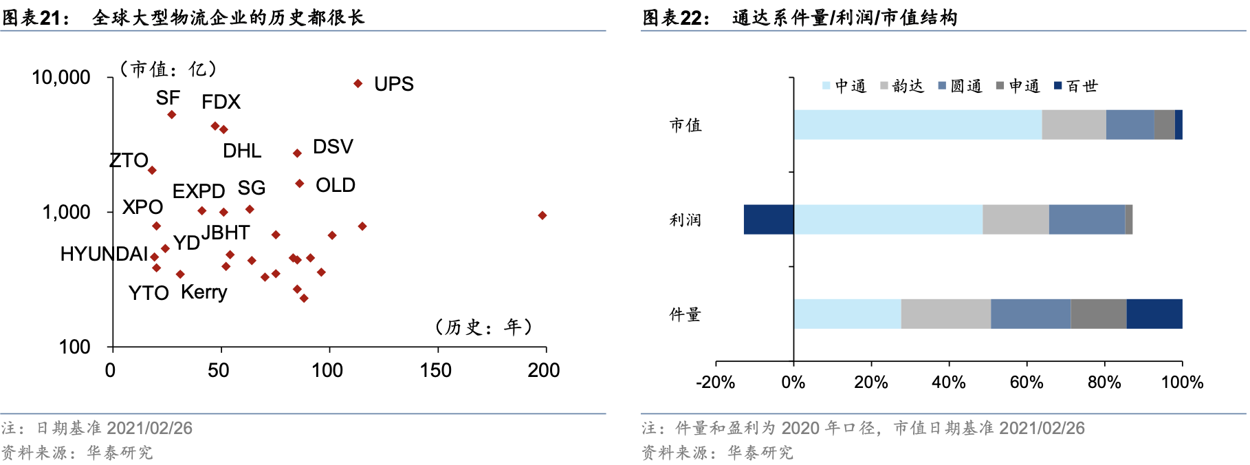 海外大型物流企业(市值>200亿)历史普遍超过50年,甚至达到100年。中国经济与电商红利让最优秀的快递企业实现赶超,但这一过程也长达20-30年,中通可能是过去20年全球成长最快的物流企业。中国物流企业国际化还处于探索阶段,这意味着更大的增长潜力。