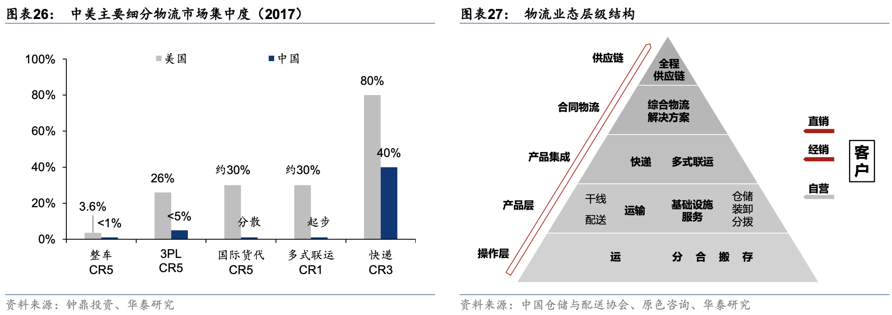 我们将物流业划分为五层——操作层、产品层、产品集成、合同物流和供应链服务,标准化程度依次下降,客户需求、资产复用、信息技术和资本驱动物流企业综合化,并购补齐网络和产品是重要手段。