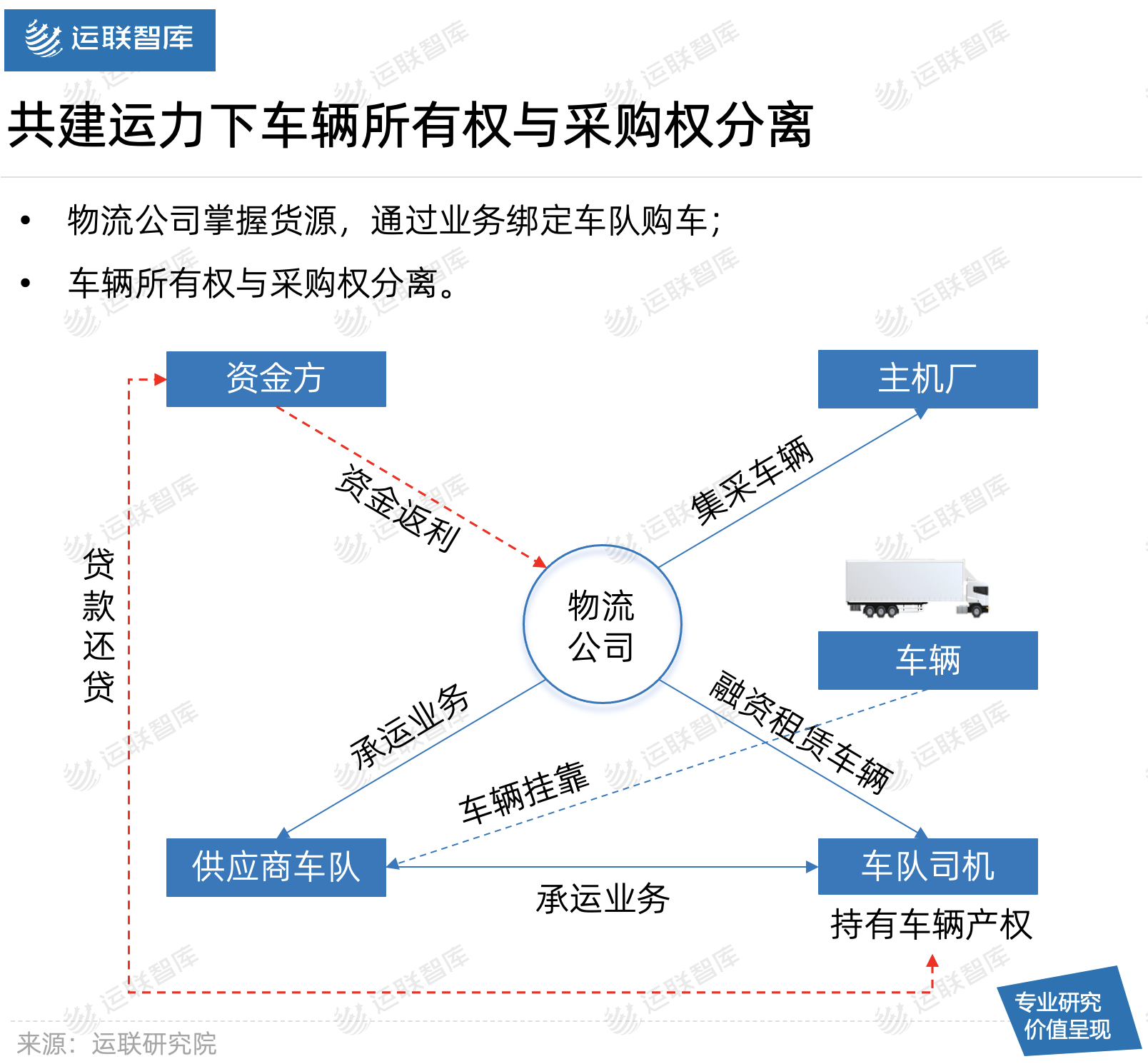运力组织化和零散运力平台化趋势下,维保订单需求更加集中。以共建运力为例,部分物流公司采用共建运力模式。共建运力模式下,物流公司掌握货源,通过业务绑定车队,让车队下的司机在物流公司处购买车辆并挂靠在车队,致使车辆所有权和采购权发生分离。