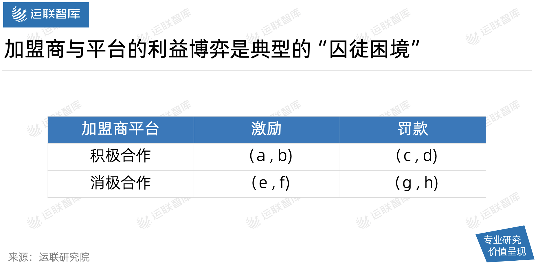 如果平台选择惩罚,加盟商选择消极合作,那么平台的收益就会下降为B+h,加盟商的收益就下降为A+g。这种情况就是博弈中最差的情况。