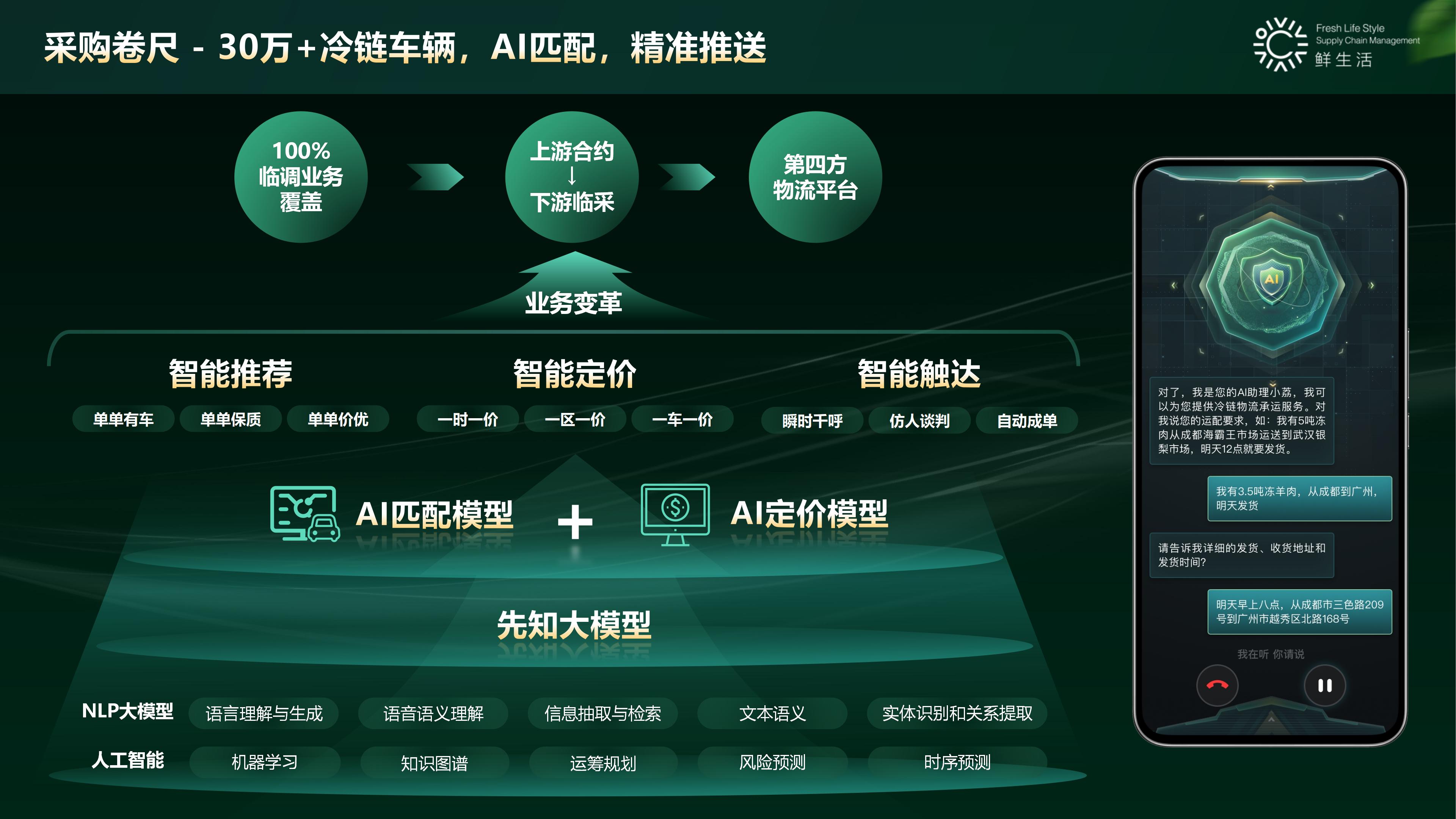 过去一段时间,我们鲜生活冷链物流在产业标准化基础上,用数字化重构了一次产业链,成就了行业中的领先地位。下一步,我们必须极速拥抱数智化。在已有的数字化优势基础上,用Ai再重做一次产业链,实现提效降耗,风控溯源,服务体验上的全面升级。