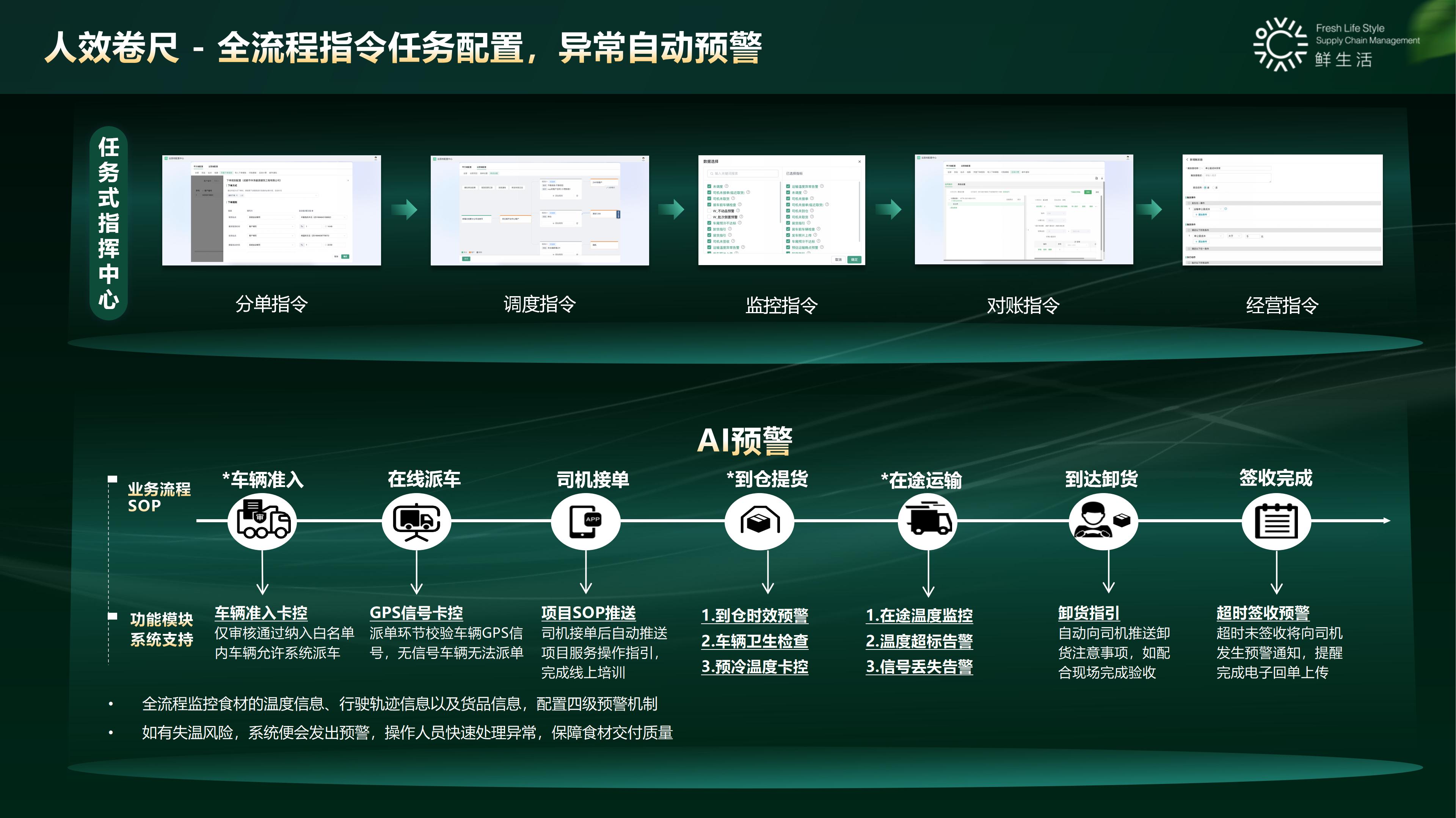 AI-SOP指令模型将AI嵌入到冷链物流整体运营SOP中,形成了分单指令、调度指令、监控指令、对账指令和经营指令的大数据模型,确保货物准确分配到车、合理安排司机工作任务、优化运输路线和资源配置、持续监督运配过程中各个环节、及时发现并处理异常情况、保证运配费用的准确计算和核对,解决冷链物流行业有经验的运营人员短缺、各客户操作SOP各不相同操作繁琐的行业痛点。