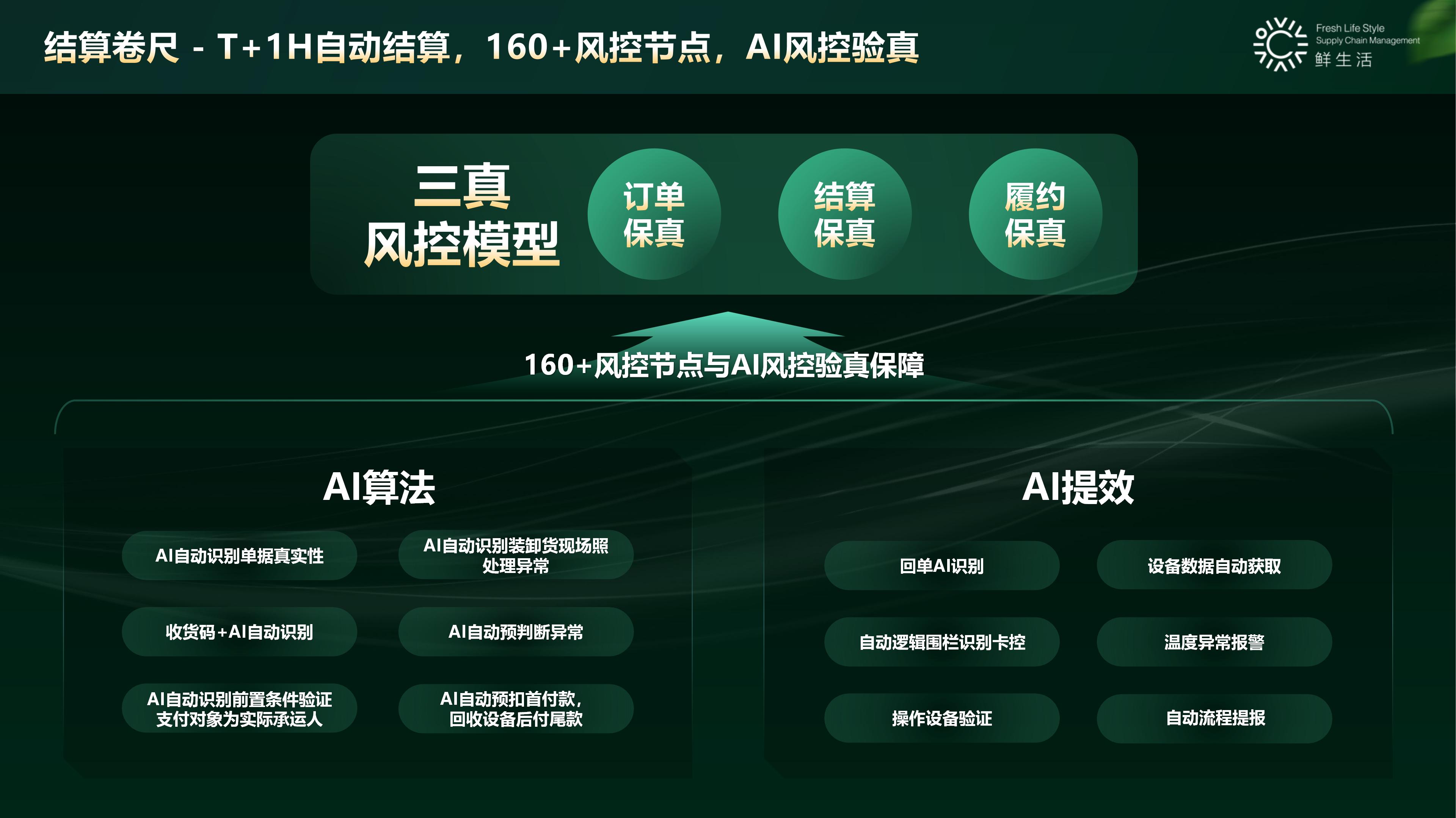 通过订单保真、结算保真、履约保真的三真风控模型对结算链条的160+风控节点进行AI风控验真,AI风控平台确保整个运配履约过程的数智化品质与风险管理。在完成货品签收后的1小时内(T+1H),AI风控平台即可快速完成整个结算流程,解决行业难对账、结算慢、效率低的痛点。